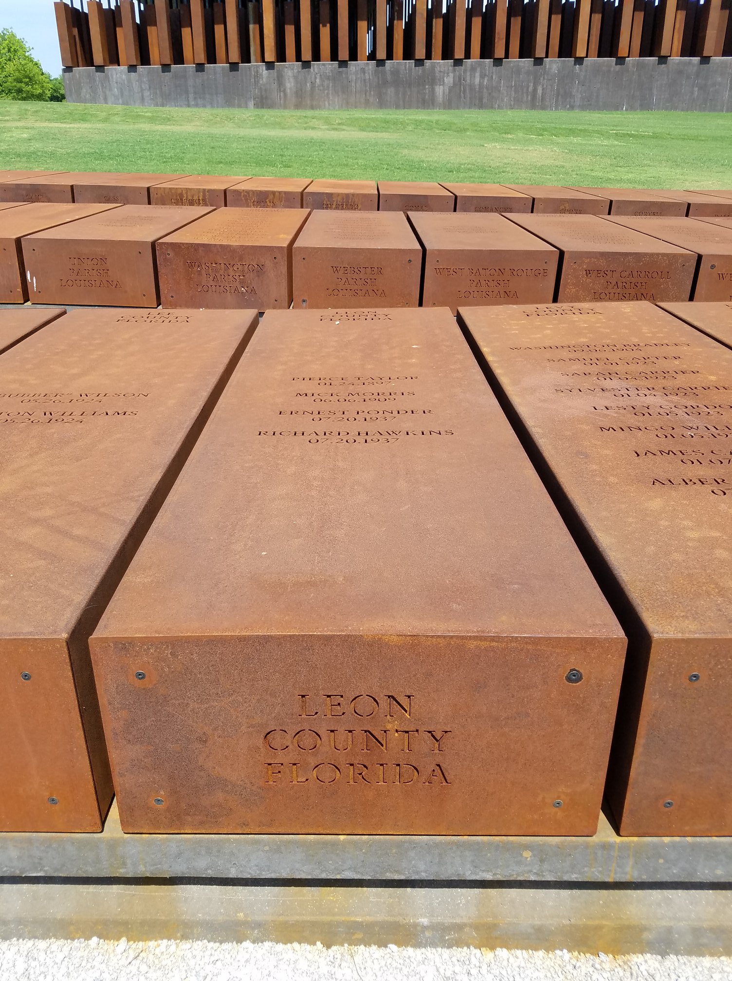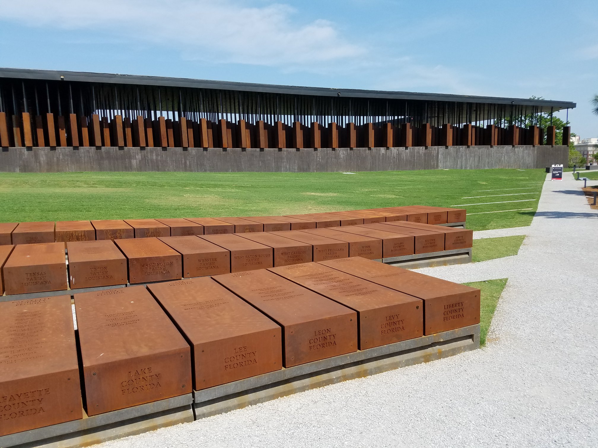 Today, the metal memorials laid out in Montgomery at the new Peace & Justice Center include a solemn row for the Florida counties where lynchings occurred. They sit like rusting coffins waiting in the grass beside a Center where matching metal boxes hang from an extensive ceiling, evoking an architect’s impression of bodies dangling in the sky.