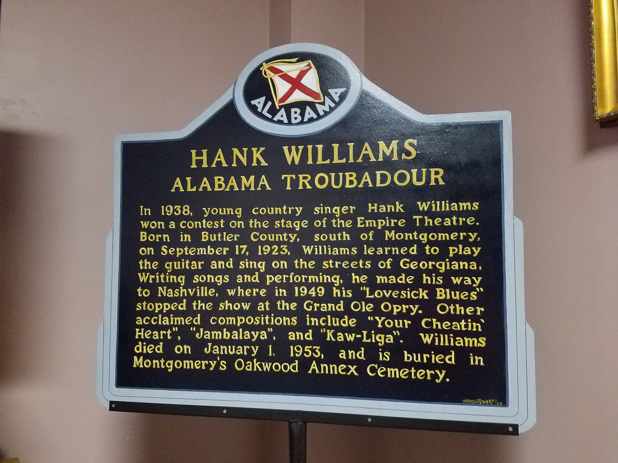 This past weekend, Jim and I made a pilgrimage to the places in Montgomery where Hank Williams’ legend still can be seen. — His statue by the Alabama River. The markers that tell about his life and music. The baby blue Cadillac in which he died so young.