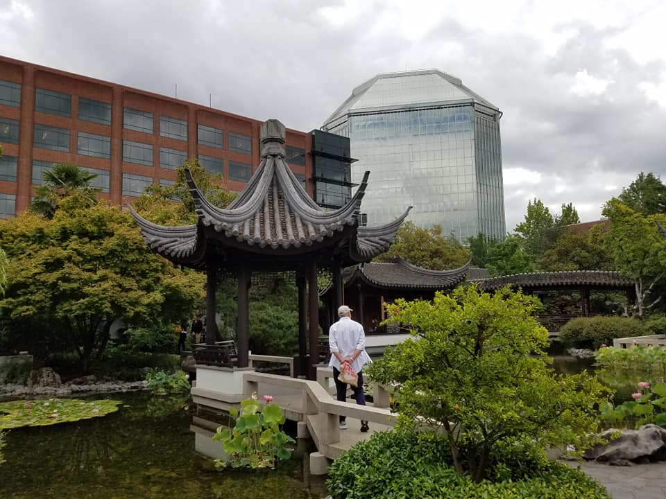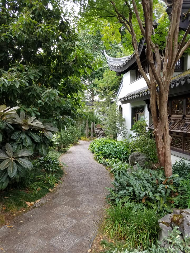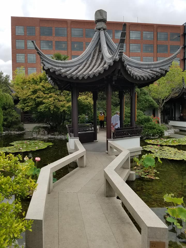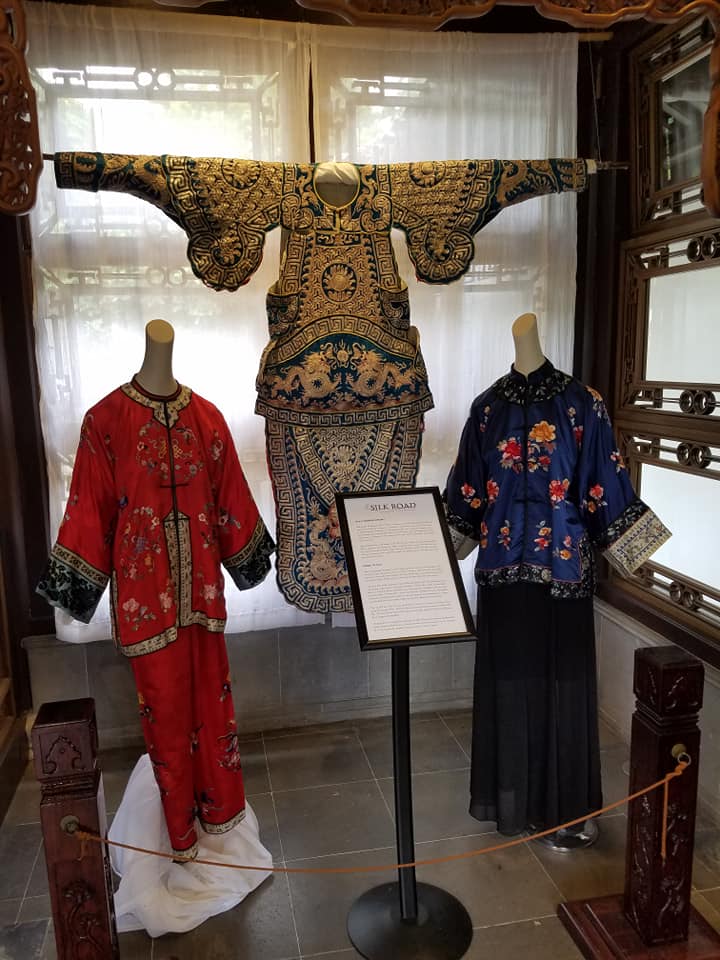 The garden follows Chinese principles of the Dao and Confucianism. There are serpentine walkways and zigzag bridges over the small lake built as the garden’s centerpiece. And traditional Chinese artists work in some of the buildings, including formal silk work.