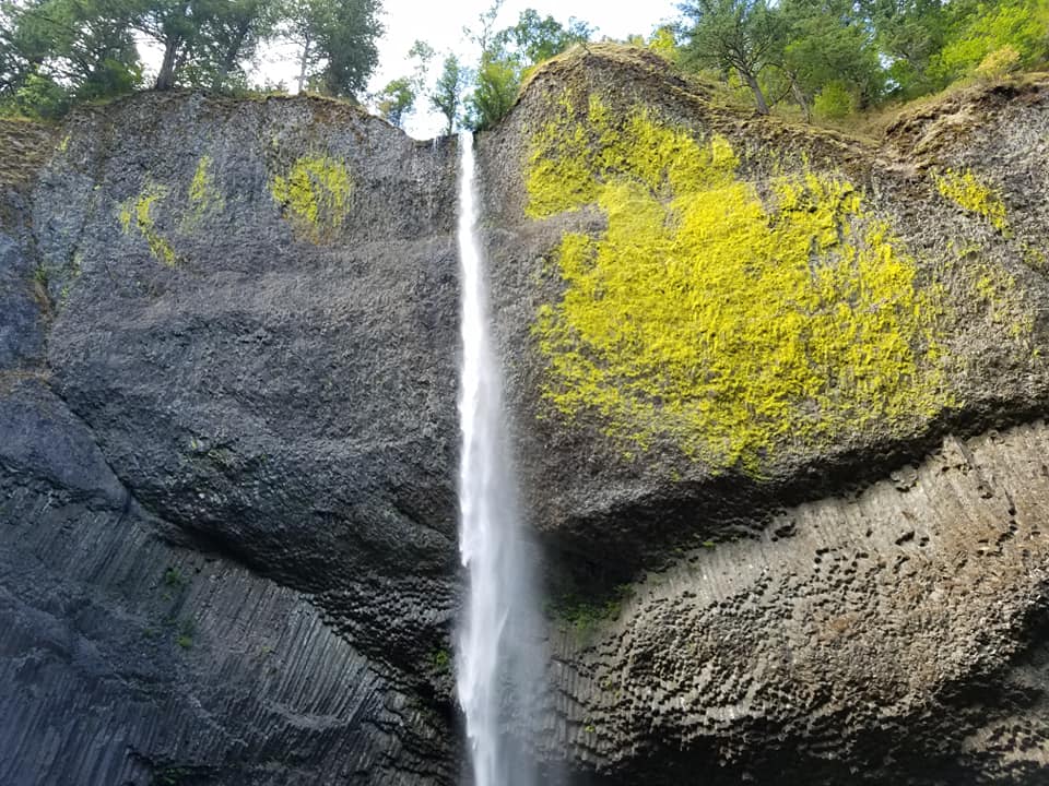 The falls plunge 224 feet over a wall of column-shaped volcanic basalt. Part of the rock face is covered with a light green lichen that catches light and can make stunning photographs.