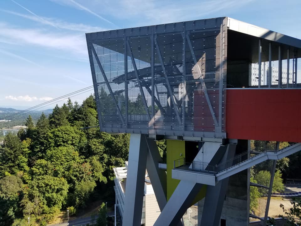The tram’s gondolas travel 3,300 feet west from the Willamette River shoreline while also rising 500 feet to the top of Marquam Hill. Its aerial cable system crosses Interstate 5 in the process.