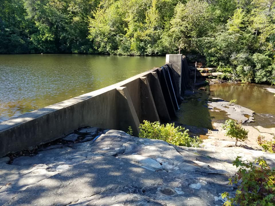 The dam today has been shorn of its top portion and of the hydroelectric plant that received water through a now vanished pipeline. Only the original concrete impoundment structure remains.